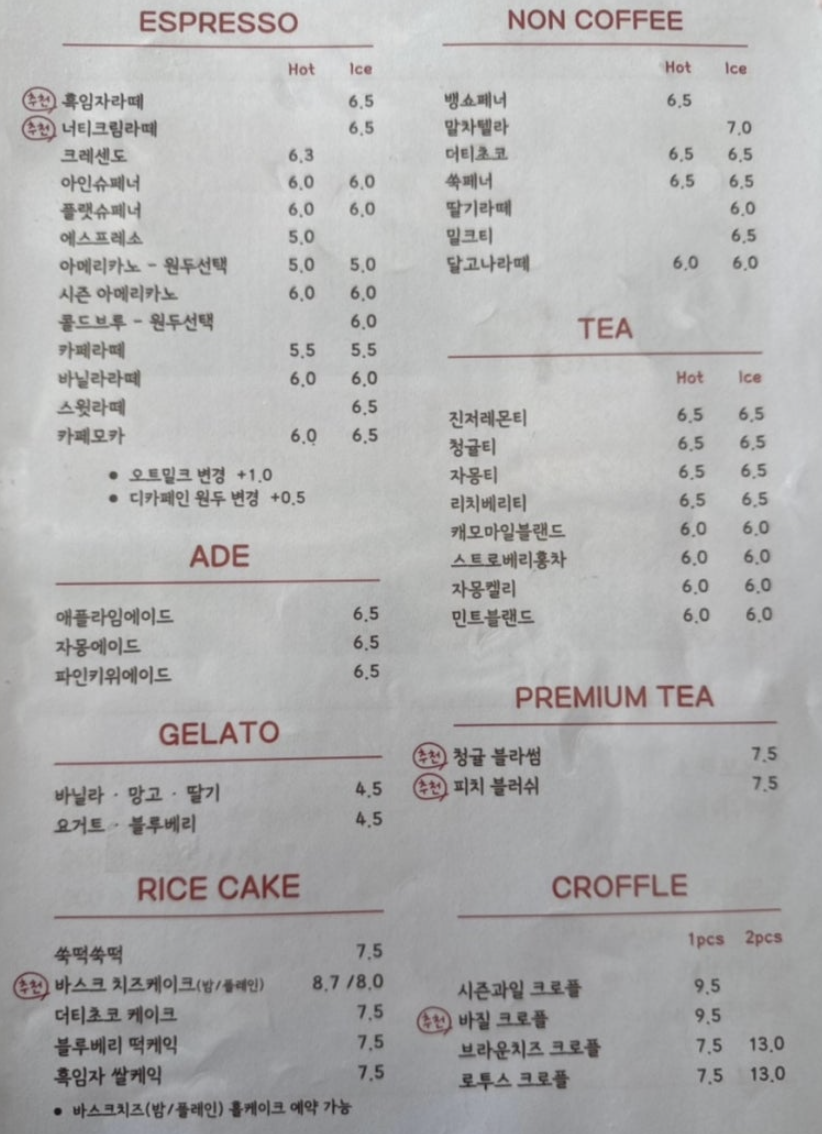 - 추천 메뉴: 더티초코(6,500원), 밤바스크치즈케익(8,700원),망고빙수(28,000원)