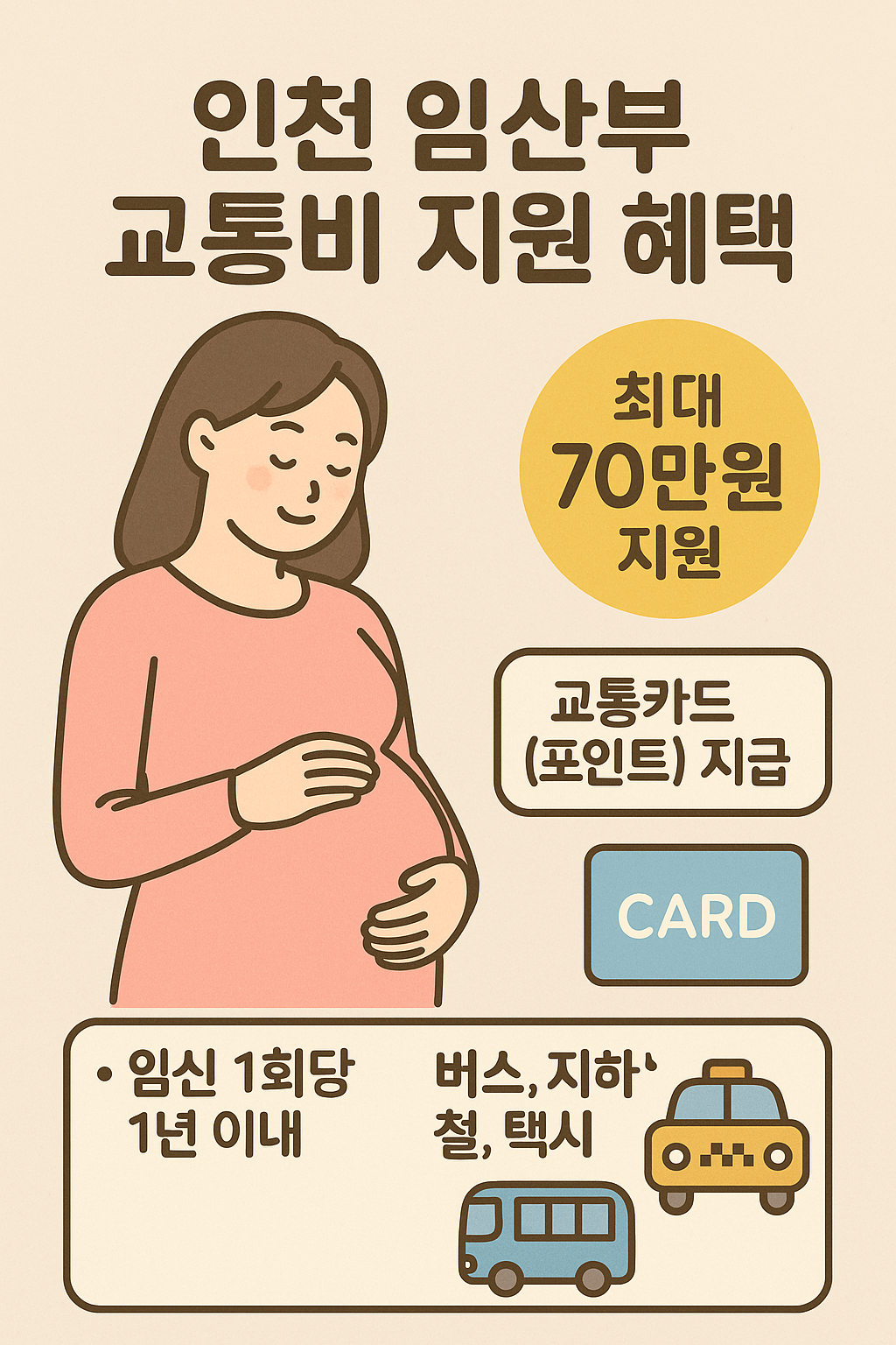인천시는 임산부의 이동 편의성을 높이기 위해 70만원 상당의 교통비를 지원하고 있습니다. 임신과 출산에 따른 부담을 덜고 보다 편안한 생활을 누릴 수 있도록 꼭 신청하시길 바랍니다.